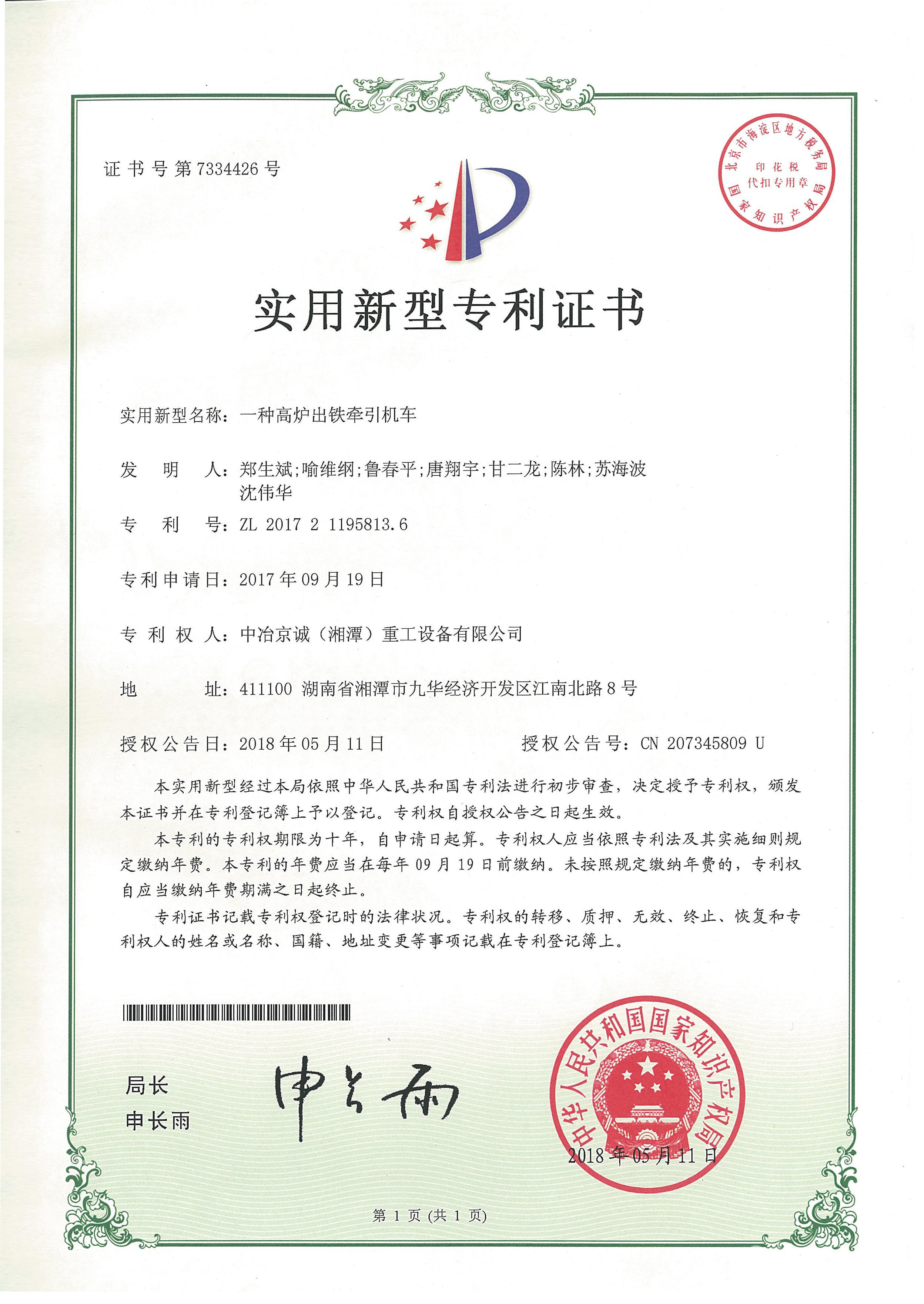 2017年湘重公司申请了一项实用新型专利:高炉出铁牵引机车。该机车是纯电力驱动,所以也称电力机车,“江湖人”称“铁牛”。“铁牛”的作用是用来替代高炉下内燃机车辅助出铁的功能,“铁牛”的使用可大大降低炼铁生产成本并提高高炉出铁时辅助设备的机动可靠性。